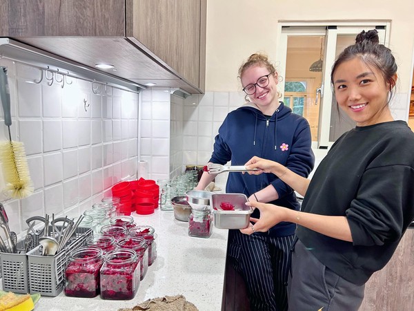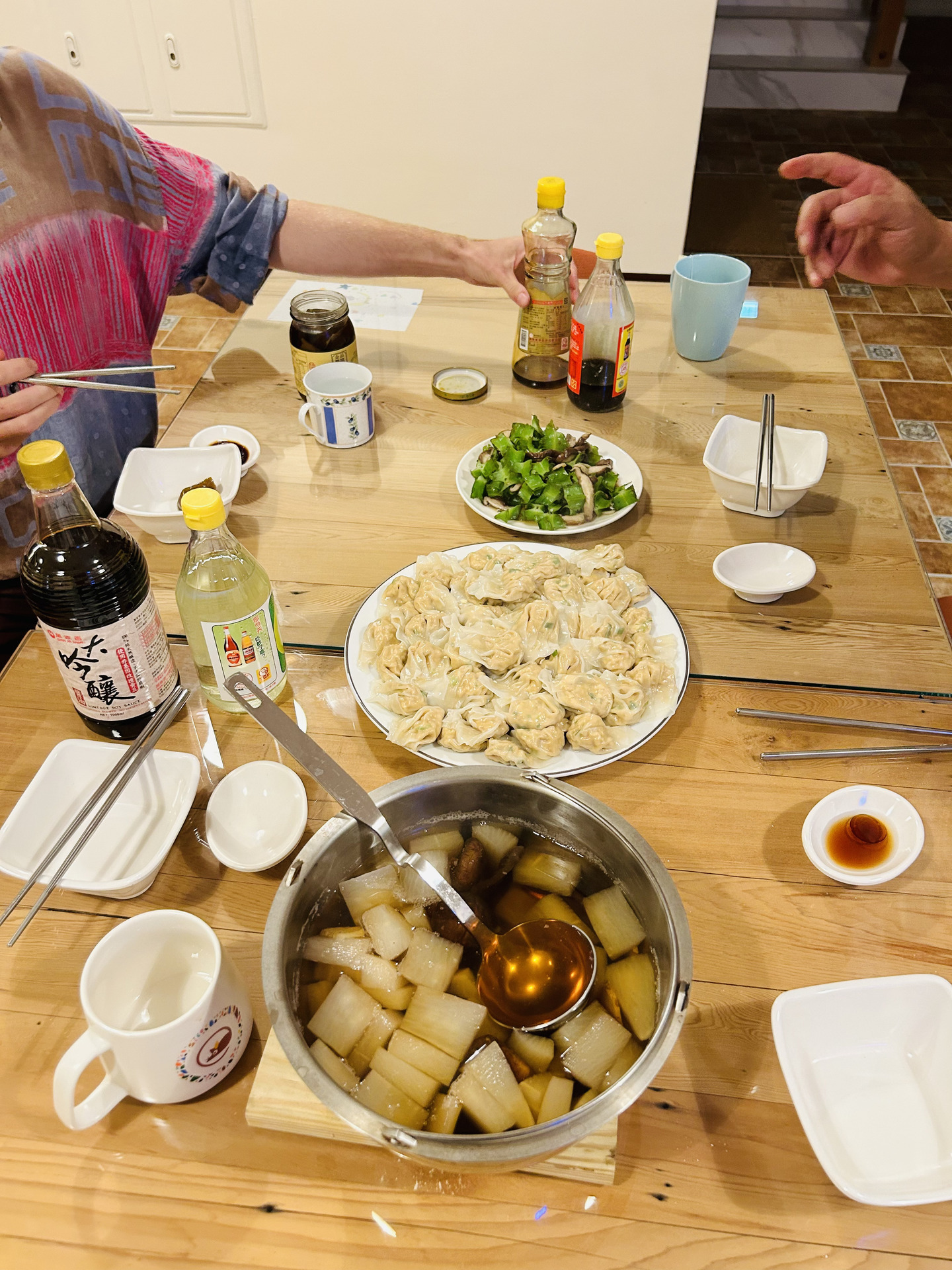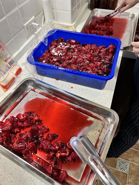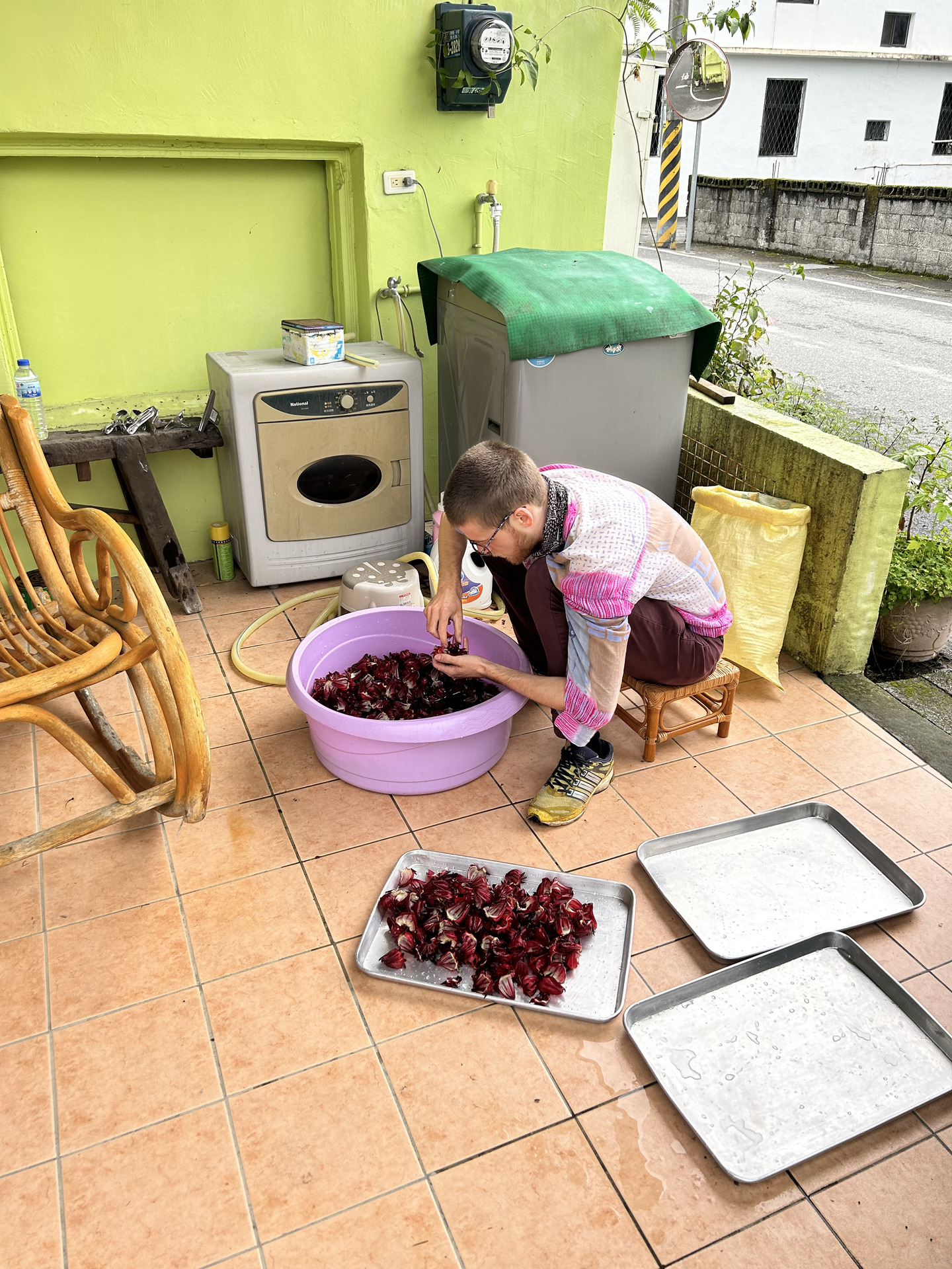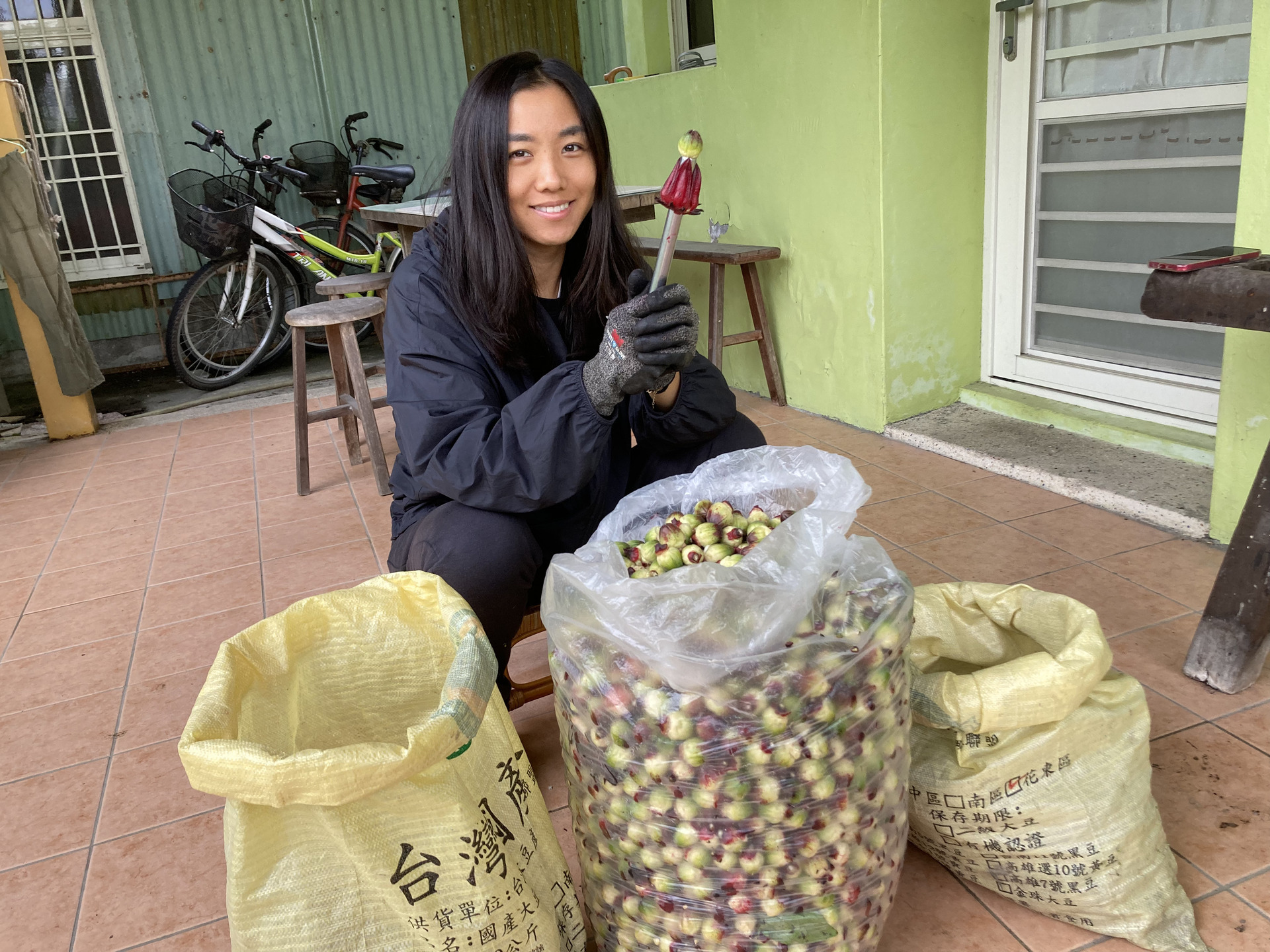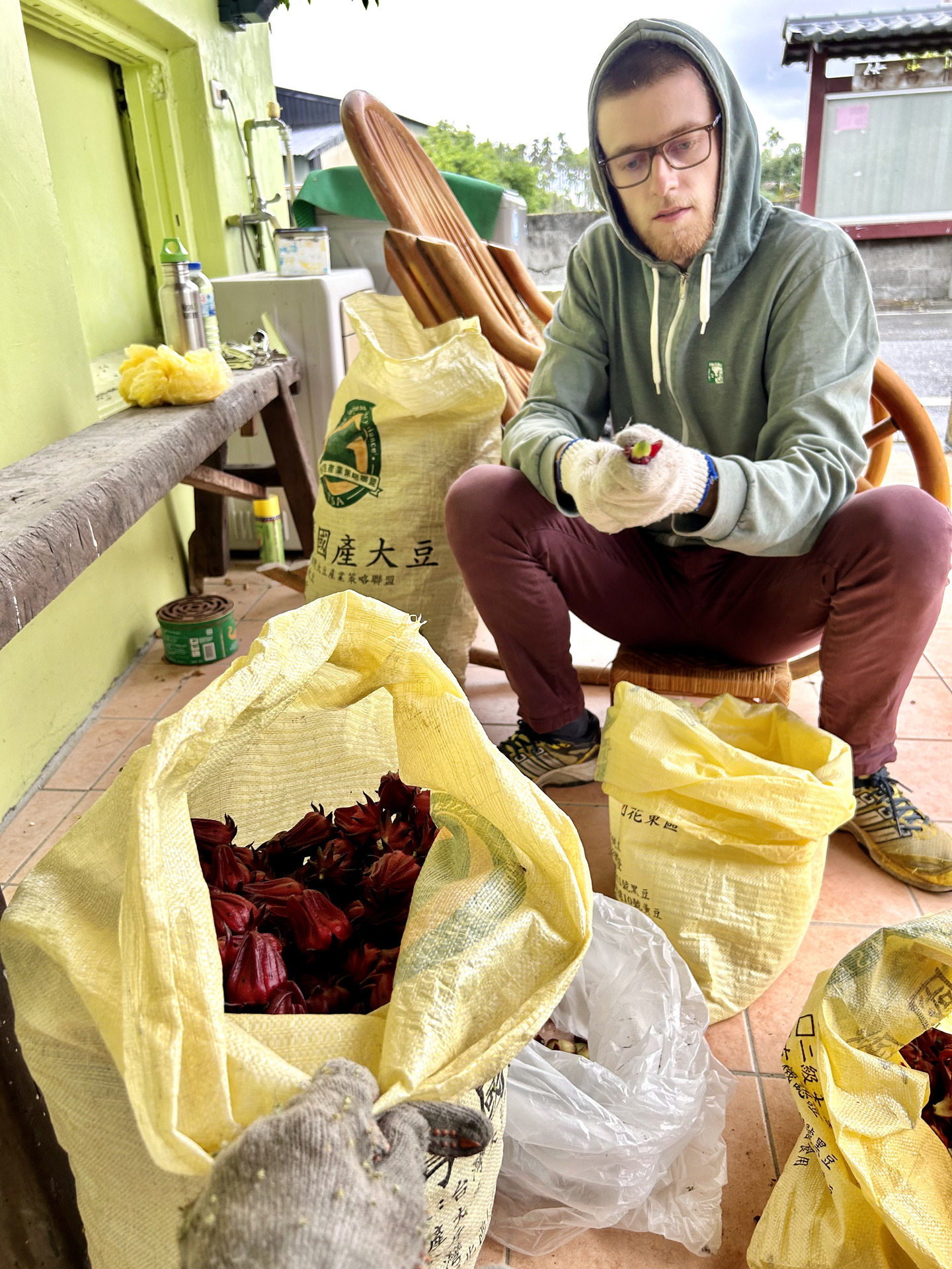 At the time of our arrival the most urgent work was roselle harvesting and sowing the rapeseed/radish seed mix. Shiwen and I were responsible for picking roselle sepals (part that surrounds and supports the flower petals and also contains seeds, which expands and matures into an accessory fruit) in the mornings and removing the seeds in the afternoons, while Uncle Tien sowed the seed mix. Harvesting the roselle fruits is based on the size of the fruits, which can be subjective and hard to judge as the size is relative. Once we picked the biggest ones, others suddenly started looking big enough as well, so the ones we picked would get smaller and smaller … Thus, it is important as well to know when to stop with one tree and move on to the next. We also needed to coordinate and plan who is doing which tree so that we don’t overlap or rework and get stuck in a cycle of “going smaller” as mentioned above. Working in the fields was truly meditative, with the smell of the fresh grass and fruity air, the singing of birds and insects, the touch of gentle wind and morning sunshine. It was very fortunate for us to be in the fields in the “winter” period, the morning and afternoon sun was quite comfortable, only the hours around noon it could still get pretty hot, which is why we had long midday breaks. The roselle fruit is processed into sweet pickle, jam and flower tea. For the tea, the fruit has to be dried in another factory, while the jam and the sweet pickle is produced directly at Uncle Tien’s place. One afternoon Shiwen and another volunteer helped with the process of making sweet pickle and it was really fun! It is a pity though we did not get to work on soybeans which are the source of the farm’s other main products: unprocessed soybeans and miso paste. To us soybeans are particularly interesting as soy-products are often essential parts of a vegetarian diet, especially many meat replacements are soy-based. Fun fact we did not know before: the first step of all forms of tofu and other soy-products is soymilk, which then gets further processed by various means. Hopefully we can make another visit to the farm at the right time for some work involving soybeans in the future.