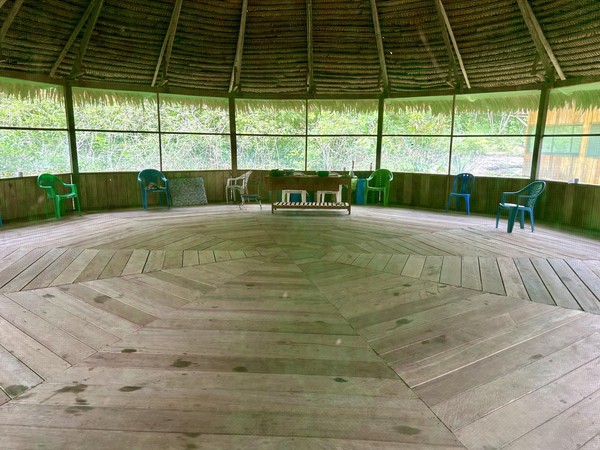 The ceremony started at 9 in the evening, it was a big round room with nets as windows, we each got a plastic chair, yoga mat and a bucket. The 3 shamans were sitting behind a table facing the door, many more family members were spread around the room. During the ceremony they would all be drumming and chanting whilst moving through the room. We were given half a cup of Ayahuasca and drank it in one go, after which everyone was supposed to keep their eyes closed and try to mostly sit in order to avoid getting sleepy. Singing and rhythmic music started and continued throughout most of the time, with regular short breaks of silence. No one talked and we were encouraged to keep as silent as possible, which turned out to not be possible later on. Our only interactions with the people should be asking for help when going to the bathrooms, which turned out not to be necessary for us.